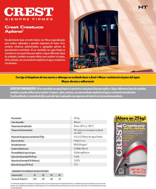 CRESTRecubrimiento base cemento blanco con fibras especializadas para realizar aplanados a grandes espesores de hasta 4cm, contiene refuerzos poliorient...