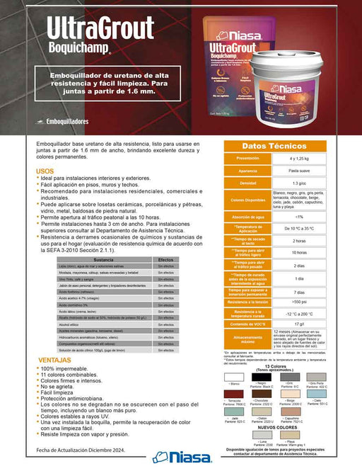 NIASAUltraGrout® Boquichamp® es un emboquillador base uretano de alta resistencia, listo para usarse en juntas a partir de 1.6 mm de ancho, brindando ex...