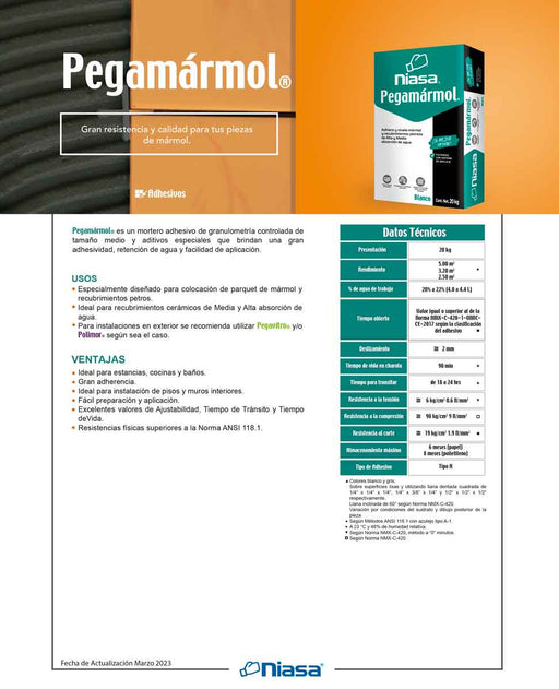 NIASAPegamármol® es un mortero adhesivo de granulometría controlada de tamaño medio y aditivos especiales que brindan una gran adhesividad, retenció...