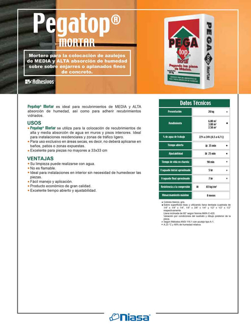 NIASAPegatop® Mortar es ideal para recubrimientos de MEDIA y ALTA absorción de humedad, así como para adherir recubrimientos vidriados. USOS Pegatop®...